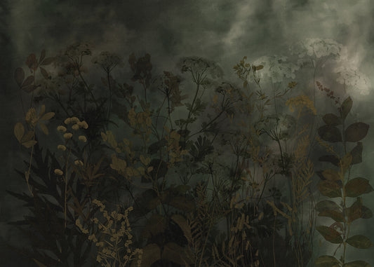 Transformez votre espace avec le papier peint Feronia, représentant une prairie sombre et maussade aux riches tons vert forêt. Conçue pour un intérieur sophistiqué, cette fresque crée une ambiance chaleureuse qui évoque calme et élégance. Idéale pour apporter de la profondeur et une touche de mystère naturel à n'importe quelle pièce.